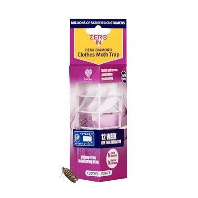 Zero In Demi-Diamond Clothes Moth Trap contains a pheromone in a glue pad that catches clothes moths so that you can identify an infestation and so take steps to prevent them from damaging woollens, silk, furs and natural fibres in household wardrobes and cupboards Chemical and poison-free clothes moth repellent lasts for up to 12 weeks Fragrance-free, non-staining treatment does not drip The monitoring glue traps are designed by experts and tested by pest control professionals combing pheromone technology with a large catching surface to provide maximum monitoring Refill with Zero In Demi-Diamond Clothes Moth Trap refills to monitor for these pests for a further 24 weeks Where infestations are found use Zero In Clothes Moth Killer or use Zero In Moth Balls, Weight: 0.110231131 Pounds, Manufacturer: STV
