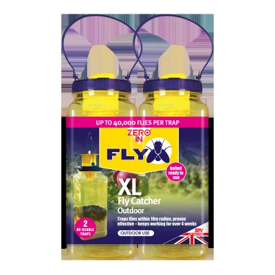 The Zero In Outdoor Fly Catcher is a ready-baited, refillable trap designed for outdoor use, effectively attracting and catching up to 40,000 flies over a 10m radius for up to 4 weeks. Ideal for gardens, bin areas, and kennels, it features simple setup and a unique 4-way entry cap.