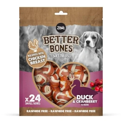 Zoë Better Bones Rawhide-free soft dog treats in a resealable pouch. These bone-shaped chicken-wrapped chews are perfect for training, rewards or just a treat for your adult dog or puppy. Safe for your dog or puppy to chew, Better Bones help maintain your dog's teeth and gums. Better dental hygiene means a healthier, happier dog. Better Bones dog training treats are suitable for small, medium and large dogs and puppies of all ages. Intended for intermittant feeding, these dog bones, with no added salt, are easy to digest. Feed 1 or 2 per day as a reward or dog training treat. Soft treats to help satisfy your dog's natural chewing instinct. Always feed your dog under supervision and provide fresh water daily.