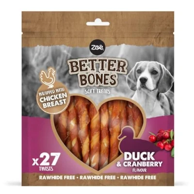 Zoë Better Bones Rawhide-free soft dog treats in a resealable pouch. These chicken-wrapped twists are perfect for training, rewards or just a treat for your adult dog or puppy. Safe for your dog or puppy to chew, Better Bones help maintain your dog's teeth and gums. Better dental hygiene means a healthier, happier dog. Better Bones dog training treats are suitable for small, medium and large dogs and puppies of all ages. Intended for intermittant feeding, these dog bones, with no added salt, are easy to digest. Feed 1 or 2 per day as a reward or dog training treat. Soft treats to help satisfy your dog's natural chewing instinct. Always feed your dog under supervision and provide fresh water daily.