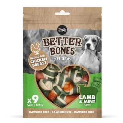 Zoë Better Bones Rawhide-free soft dog treats in a resealable pouch. These bone-shaped chicken-wrapped chews are perfect for training, rewards or just a treat for your adult dog or puppy. Safe for your dog or puppy to chew, Better Bones help maintain your dog's teeth and gums. Better dental hygiene means a healthier, happier dog. Better Bones dog training treats are suitable for small, medium and large dogs and puppies of all ages. Intended for intermittant feeding, these dog bones, with no added salt, are easy to digest. Feed 1 or 2 per day as a reward or dog training treat. Soft treats to help satisfy your dog's natural chewing instinct. Always feed your dog under supervision and provide fresh water daily.