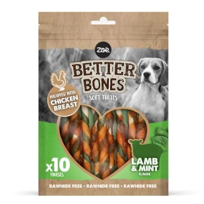 Zoë Better Bones Rawhide-free soft dog treats in a resealable pouch. These chicken-wrapped twists are perfect for training, rewards or just a treat for your adult dog or puppy. Safe for your dog or puppy to chew, Better Bones help maintain your dog's teeth and gums. Better dental hygiene means a healthier, happier dog. Better Bones dog training treats are suitable for small, medium and large dogs and puppies of all ages. Intended for intermittant feeding, these dog bones, with no added salt, are easy to digest. Feed 1 or 2 per day as a reward or dog training treat. Soft treats to help satisfy your dog's natural chewing instinct. Always feed your dog under supervision and provide fresh water daily.