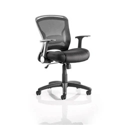 Breathable mesh backrest with a fixed lumbar support pad. Soft moulded twin cushion seat design with stitch detail. Single lever lock tilt mechanism. Weight tilt tension control. Folding arms as standard. Nylon five star base.