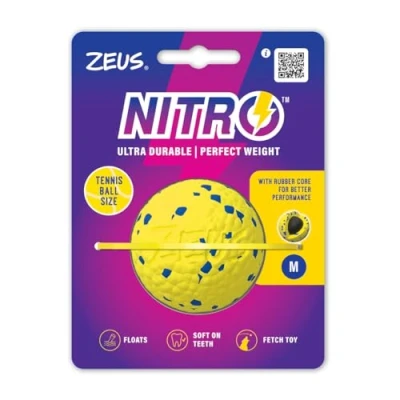 This dog ball is built with a natural rubber core for powerful, long-distance throws Crafted from tough NITRO materials that stay gentle on your dog's teeth and gums The dog ball will retain its high bounce for non-stop, exciting play sessions Available in three sizes to suit all small, medium and large dogs Easy to clean and fully dishwasher-safe for hassle-free maintenance