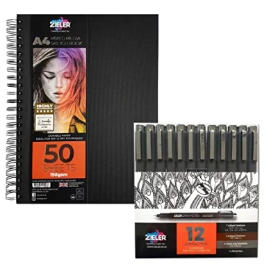 12 FINELINE DRAWING PENS - Black nib sizes: 0.05mm, 0.1mm, 0.2mm, 0.3mm, 0.4mm, 0.5mm & 0.8mm. Plus 1 broad pen. Grey nib sizes: 0.5mm & 0.8mm. Sepia nib sizes: 0.5mm & 0.8mm. A wide variety of nib sizes and 3 colours allow you to capture thin and thick strokes through depth and definition. PIGMENT INK – Intense ink colour stands out on the page. The pigment ink means your work is protected against water and will not fade even in extreme light. Acid-free and quick-drying so the ink will not smear if a highlighter is used or even if water is spilt onto the page. HIGH PRECISION & HIGH QUALITY – Metal-encased nibs provides high precision and durability – particularly good for fine, detailed work using with rulers and stencils. Each nib is made with high quality fibres and each lid has a durable metal clip to aid portability. Suitable for a wide range of work including drawing, sketching, writing, illustration, animation, outline, doodling, scrapbooking and crafting. Ideal for right and left-handed artists of all levels. HARDBACK SPIRAL MIXED MEDIA SKETCH BOOK - 50 sheets, 150gsm, Portrait. The soft white, smoothness of each page helps you to achieve a unique depth and fine retention of your details. Each page is micro perforated for an easy tear should you wish to extract you work from the book. ✔ DURABLE HARDBACK – Classic design. The black microline cover both looks attractive and keeps your work safe and protected. Helps keep paper flat, preventing creasing and provides excellent supports when using on uneven surfaces or outdoors. Twin metal wiro bound allows the you to turn the pages easily and effortlessly knowing that the pages will lie flat each time.