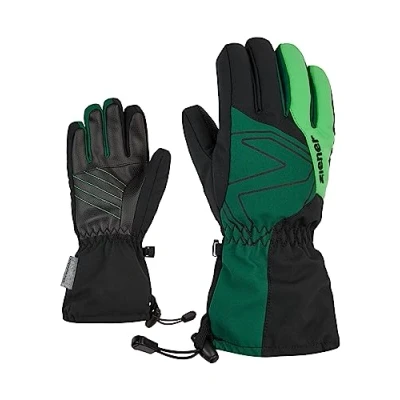 Trendy girls' ski gloves with asymmetrical design Waterproof and windproof thanks to Ziener Aquashield Warm and soft lavalan wool padding Wide Velcro strap for wearing over the jacket Long cuff with cordlock closure, incl. Leash