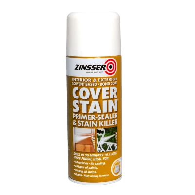 General description Zinsser Cover Stain® Aerosol is a versatile interior and exterior primer, sealer, stain sealer, and bond coat designed for quick and effective application. It dries for recoat in just two hours, providing excellent stain blocking and adhesion for a smooth, blemish-free finish. This product is particularly effective on nicotine, water, smoke, cedar, and redwood stains, making it ideal for various surfaces. Technical specifications Container type: Aerosol Volume: 400ml Color: White (tintable) Type: Primer, sealer, stain sealer, bond coat Coverage: Approximately 7-10m² per litre Touch dry: 35 minutes Hard dry: 4-7 days Recoatable: 2 hours Compatibility and accessories Suitable for interior and exterior surfaces Compatible with all decorative top coats Can be applied with aerosol spray, brush, roller, or pad Installation Shake well before use Apply evenly to clean, dry surfaces Ensure proper ventilation during application Allow sufficient drying time between coats if