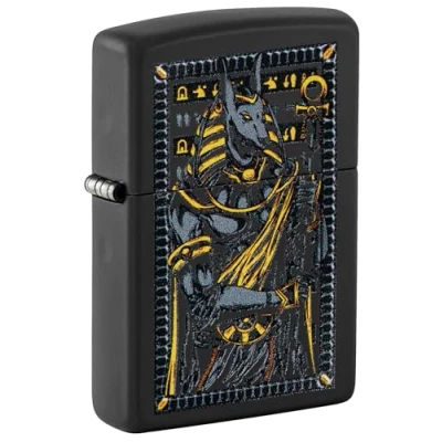 Known as the protector of graves and the afterlife, the Egyptian god Anubis appears on this classic Black Matte lighter in a bold and mysterious Color Image design. Supplied in a genuine Zippo standard black box. Stormproof petrol lighter, please refill only with genuine ZIPPO brand lighter fluid (Sold Separately). Flint wheel ignition. Includes Zippo Lifetime Warranty.