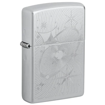 Zippo Windproof lighter in nostalgia/vintage design: an ornate net of stars and planets gives the satin chrome lighter a nostalgic midcentury look. Windproof & Reliable: Made from durable brass and with a windproof flame, this Zippo windproof lighter is the perfect companion in any weather. Whether camping, hiking or in everyday life, it ensures reliable ignition in any situation REFILLABLE, REUSABLE & WITH LIFETIME WARRANTY: Designed for long-lasting use: the refillable Zippo windproof lighter is a sustainable choice and comes unfilled. For optimal performance, we recommend original Zippo premium lighter fuel, flints and wicks. Zippo offers a lifetime warranty with the motto: "It works or we repair it for free." The legendary Zippo click & cult status: the unique Zippo click sound, known from movies, music and pop culture, received a patent in the USA in 2018 and highlights the cult status of this lighter. It is a symbol of tradition and quality PERFECT GIFT Whether it's for Christmas, birthday, anniversary or as a classy collector's item, this Zippo lighter is the ideal gift for men & women. Supplied in a high-quality gift box, it is a stylish highlight for lighter lovers