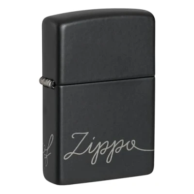 Zippo Windproof Lighter, Logo Script Lettering Design Matt Black with Chrome, Laser 360 Refillable, Reusable, Comes in Gift Box Made USA