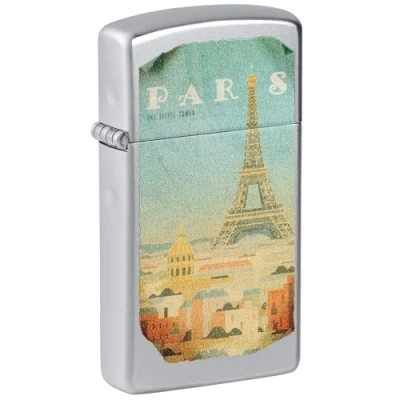 Zippo Windproof Lighter Paris, Slim Satin Chrome, Colour Image, Refillable, Reusable, Design, Gift Box, Made in USA
