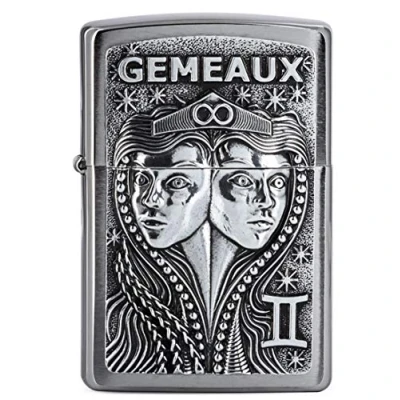 Zippo Windproof Lighter, Zodiac Gemini Design Brushed Chrome, Emblem Refillable, Reusable, Comes in Gift Box Made USA