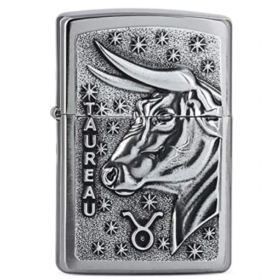 Zippo Windproof Lighter, Zodiac Taurus Design Brushed Chrome, Emblem Refillable, Reusable, Comes in Gift Box Made USA