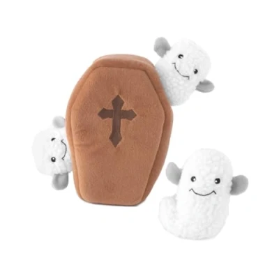 FUN CHARACTERS - Dogs will have hours of fun playing with 3 ghosts and digging them out of their coffin EXCLUSIVE NOISEMAKERS - Each ghost includes 1 high-quality round squeaker to deliver more sound to keep your best friend entertained INTERACTIVE PUZZLE - Challenges your dog by having them dig out the ghost characters, which stimulates interactive play JUST THE RIGHT SIZE - The coffin burrow is great for small and medium-sized dogs, but not recommended for extra tough chewers UNIQUE DESIGN - Beautifully-designed, high-quality pet products for the modern dog and dog owner