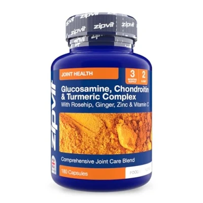 WHY CHOOSE OUR TURMERIC & GLUCOSAMINE COMPLEX?: Our formula features 1000mg of Glucosamine Sulphate and 800mg of Chondroitin Sulphate per serving, combined with Vitamin C, Turmeric, Ginger Root, Rosehip, and Zinc to provide excellent joint support JOINT & CARTILAGE SUPPORT: Our formula combines Glucosamine, Chondroitin, and Vitamin C to help support your joints and cartilage. As we age, the levels of naturally occurring glucosamine and chondroitin in our bodies decrease, our glucosamine complex can support the body to maintain healthy cartilage. EXTRA BENEFITS: Our complex is packed with ingredients renowned for their exceptional benefits. Turmeric is celebrated for its antioxidant properties, while Rosehip and Ginger are popular for their absorption and effectiveness. We've also included Zinc to support your immune system and overall health. JOINT HEALTH SUPPLY: Each serving of our high-strength formula includes 1000mg of Glucosamine Sulphate, 800mg of Chondroitin Sulphate, 100mg of Vitamin C, 50mg of Turmeric Powder, 36mg of Ginger Extract, 50mg of Rosehip Extract, and 25mg of Zinc. Plus, it’s gluten-free and GMO-free, making it perfect for those with dietary restrictions. Our capsules are sourced from crustaceans to ensure top quality. Please note, that they are not suitable for those with shellfish allergies. TRUSTED FOR 25 YEARS: For 25 years, Zipvit has been a trusted name in the health and wellness industry. Our commitment to quality, transparency, and affordable pricing has made us a leader in providing premium supplements. Trusted by millions worldwide, we're dedicated to supporting your health journey every step of the way.