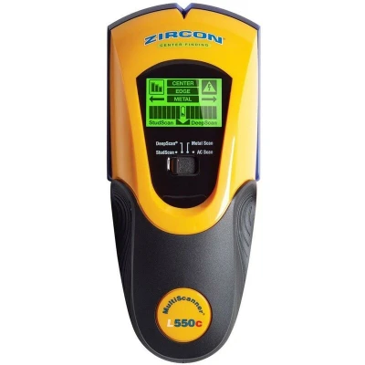 General description MultiScanner® L550 OneStep® is a multifunction stud finder designed to locate the center, edges, and direction of studs and joists behind walls, floors, and ceilings. It effectively detects metal and live AC electrical wiring, making it an essential tool for any DIY or home improvement project. Technical specifications StudScan mode locates wood or metal studs up to 3/4 in. (19 mm) deep DeepScan® mode scans up to 1 1/2 in. (38 mm) deep WireWarning® detection locates live AC wiring up to 2 in. (51 mm) deep Metal Scan mode detects non-ferrous metal (e.g., copper) up to 1 1/2 in. (38 mm) deep and ferrous metal (e.g., steel) up to 3 in. (76 mm) deep AC Scan mode locates live AC wiring up to 2 in. (51 mm) deep Ultra-bright backlit LCD display Low battery indicator Signal strength indicator Usage The Zircon L550C is user-friendly with a 4-mode switch for easy mode changes. The ultra-bright display, patented SpotLite® Pointer, and audio tone provide clear indications of