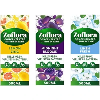 KILLS 99.9 PERCENT OF VIRUSES & BACTERIA: The powerful and unique formula is designed to effectively eliminate 99.9 Percent of bacteria and viruses as Zoflora concentrated multipurpose disinfectant cleaner kills bacteria and viruses, helping to protect your family from potentially harmful germs, whilst also eliminating odours to leave homes beautifully fragrant all day DIRECTIONS: Dilute and spray it, soak it, wipe it, mop it, or use it neat down drains and plugholes; Zoflora is a versatile 3-in-1 multipurpose concentrated disinfectant designed for various cleaning applications; it can be used either neat or diluted in water, and 500ml of Zoflora can make almost 20L of full-strength disinfectant, offering a cost-effective and efficient cleaning solution PATENTED TECHNOLOGY: Zoflora contains patented odour elimination technology, and our fragrances are tested to last at least 24 hours, leaving your home beautifully fragrant; our fragrances are crafted by expert perfumers with premium ingredients to bring luxurious scents to your home MULTI-SURFACE CLEANING: Zoflora disinfectant can be used on hard surfaces throughout your home, including floors, baths, tiles, taps, worktops, dishcloths, and toilets, or neat down drains and plugholes, providing antibacterial protection