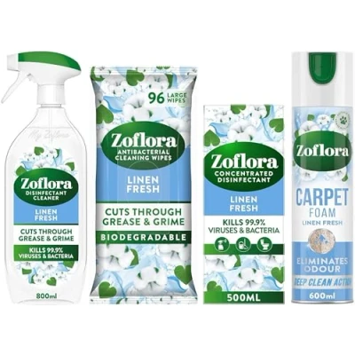 Zoflora Linen Fresh Bundle Multipurpose Disinfectant Trigger Spray, 1 x 800ml, Concentrated Disinfected Liquid 500ml, Biodegradable Wipes & Carpet Freshener Care Foam 600ml (One of each)