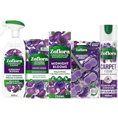 Zoflora Midnight Blooms Bundle Concentrated Disinfectant Liquid, Biodegradable Wipes, Carpet Fresh & Care Foam and Toilet Rim Blocks