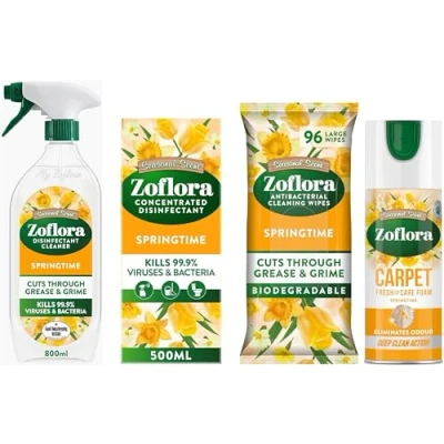 Zoflora Springtime Bundle Multipurpose Disinfectant Trigger Spray, 1 x 800ml, Concentrated Disinfected Liquid 500ml, Biodegradable Wipes & Fresh Carpet Freshener Care Foam 600ml (One of each)