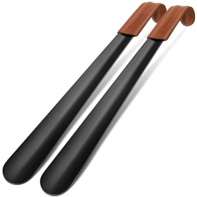 【42 CM Shoe Horn Long Handled】Our long shoe horn (2 pcs) are 42cm,which is long enough.Metal shoe horns is suitable for the elderly,pregnant women,and children to wear shoes,which is easy-to-save,wearing shoes to become easier and happy 【Black Metal Shoe Horn】Long shoe horns for men are made of metal,which is more stable and sturdy than plastic and wooden shoes.The appearance of long handled shoe horn for the elderly is smooth black.Press it gently to slide,you can easily wear shoes 【Comfortable Handle】Our long shoe horns for women are designed with arc-shaped shoe corner design,extra long shoe horns can release the pressure on the feet;long shoe horns for seniors pull the handle bent,use leather wrap,comfortable paste hand strength power 【The Use Range of Stainless Steel Shoehorn is Wide】Boot horn are suitable for most shoe,leather shoes,sneakers,high heels,boots,etc.;This shoe horn for football boots is safe for daily use.Simply wipe clean with a damp cloth 【Perfect Gift】ZOMAKE shoe stick with high-end quality is a perfect gift for you to give parents,wife,and children at Christmas,shoehorn long handle making the family full of happiness and happiness