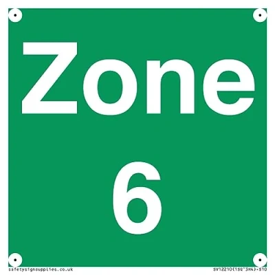 No Symbol This sign is made from plastic semi-rigid 1mm Comes with3mm Corner Holes. 1mm thin plastic sign, can be screwed, stuck with adhesive, or attached with cable ties. Not suitable for hanging. S10 square Sign Text: Zone 6