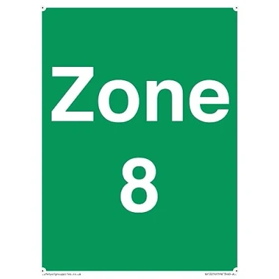 No Symbol This sign is made from plastic semi-rigid 1mm Comes with3mm Corner Holes. 1mm thin plastic sign, can be screwed, stuck with adhesive, or attached with cable ties. Not suitable for hanging. A5 portrait Sign Text: Zone 8