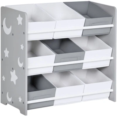 General description A child's room can be a nightmare to maintain. Make it easier with this ZONEKIZ toy organiser. There are nine compartments for keeping toys, books, clothes, shoes, and other bits, so their room stays clean, organised, and free of clutter. Gone are the days of everything scattered across the floor – these boxes ensure their room stays tidy and presentable. Technical specifications Colour: Grey and white Material: MDF, metal, and non-woven fabric Dimensions: 60H x 63L x 30W cm Each storage basket dimensions: 12H x 27L x 19W cm Weight capacity of each basket: 5 kg Suitable for ages: 3-6 years Certificated age: 3+ years Certification: EN71-1-2-3 Installation Simple assembly required. Usage Ideal storage solution for bedrooms and play areas, teaching children how to be organised.