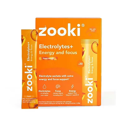 Zooki Electrolytes+ Energy & Focus, Peach Flavour 30 Sachets
