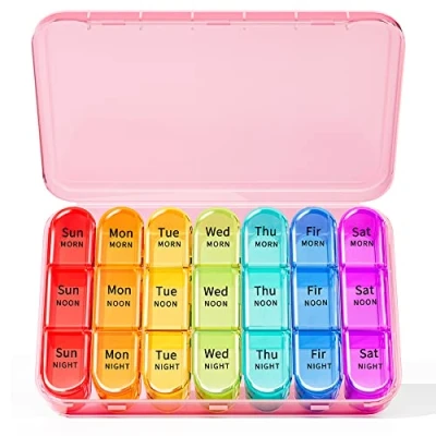 [Large Capacity]: Zoolion weekly pill organiser with 3 large compartments a day, Each separate compartment can hold 8 fish oils or 11 tablets for daily use. [BPA Free dosset box]: Our 7-day dosset box is be made of food-grade materials, healthy and odorless. It is safe for daily and medical use. [Conspicuous Remind]: Adopts UV printing technology. 7 individual colorful pill boxes organize medicine 3 times a day from morning to evening, the printing of days of the week makes it easier to distinguish for the old and child. Remind you to take pills on time to accurately manage your health. [Easy to Carry]: A good ideal pill case for travel and work, it is very convenient to put it in your handbag or pocket, Let you care your health even wherever you are. [Simple and Durable]: It is easy to open for kids or arthritis elderly. The pill container with double protection is not easy to fall, Tight and Durable. You can be used with confidence.