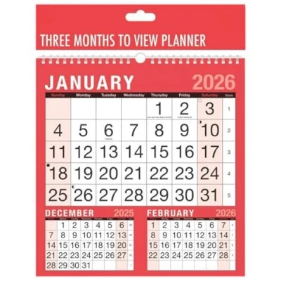 Comprehensive 3-Month View: Spiral-bound wall planner displaying three months at a glance, providing convenient organization and planning from January 1st to December 31st, 2026. Versatile Usage: Ideal for various settings including home, business, office, or school environments, catering to diverse scheduling needs and facilitating efficient time management. Space-Saving Design: Compact layout conserves space while offering ample room for notes, appointments, and reminders, optimizing functionality without compromising clarity. Sturdy and Durable Construction: Spiral binding ensures durability, allowing for easy flipping and smooth page-turning, ensuring long-lasting use throughout the year. Effortless Installation: Ready for immediate use, this wall planner is easy to hang in any desired location, providing instant access to essential dates and facilitating seamless organization.
