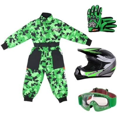 【Kids Suit】 size choice is only for reference,please check suit size picture for proper size before payment. 【Helmet&Gloves Size Match】 Helmet XS(47-48cm)+Gloves S(5cm);Helmet S(49-50cm)+Gloves S(5cm);Helmet M(51-52cm)+Gloves M(6cm);Helmet L(53-54cm)+Gloves L(7cm);Helmet XL(55-56cm)+Gloves XL(8cm). 【Kids Helmet】 motorcycle helmet ECE R22.06 approved.Lightweight ABS shell with shock-absorbing multi-density EPS.Adjustable and convenient chin strap (buckle release strap). 【Kids Goggles】Adjustable Non- Slip Strap For Secure Fit;Lightweight frame for a comfortable fit. 【Kids Gloves】Secure wrist strap closure with Hook&Loop Faster;Breathable mesh construction ;Reinforced thumb and palm.