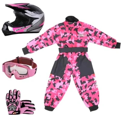 【Kids Suit】 size choice is only for reference,please check suit size picture for proper size before payment. 【Helmet&Gloves Size Match】 Helmet XS(47-48cm)+Gloves S(5cm);Helmet S(49-50cm)+Gloves S(5cm);Helmet M(51-52cm)+Gloves M(6cm);Helmet L(53-54cm)+Gloves L(7cm);Helmet XL(55-56cm)+Gloves XL(8cm). 【Kids Helmet】 motorcycle helmet ECE R22.06 approved.Lightweight ABS shell with shock-absorbing multi-density EPS.Adjustable and convenient chin strap (buckle release strap). 【Kids Goggles】Adjustable Non- Slip Strap For Secure Fit;Lightweight frame for a comfortable fit. 【Kids Gloves】Secure wrist strap closure with Hook&Loop Faster;Breathable mesh construction ;Reinforced thumb and palm.