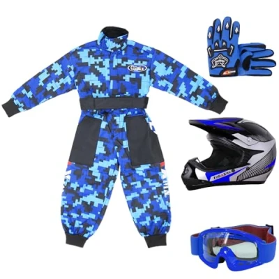 Zorax XL(11 12 Years) Kids CAMO Suit & Gloves XL(8cm) Goggles ZOR X19 Blue XL (55 56cm) PREDATOR Motocross Helmet ECE 2206, Child Dirt Bike Motorocycle Clothing Set
