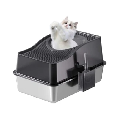 EFFECTIVE ODOR CONTROL The sealed design keeps scatter odors trapped inside, ensuring that your living space stays fresh and inviting for both you and your pets. The closed design provides cats with a private and safe space. DURABLE & SCRATCH RESISTANT This stainless steel cat litter box with a high quality stainless steel bottom tray is odor resistant, easy to clean with water and provides excellent corrosion and scratch resistance. Unlike conventional plastic cat litter boxes, it has a longer service life and is therefore suitable for long-term use by cats. UNIQUE RADIAN DESIGN FOR USABILITY The low radian design of this litter box allows kittens and older cats easy access and makes them pet friendly and suitable for cats of all ages. This covered cat litter box offers 2 size options with high sides to meet their needs. XL 60 x 40 x 34.5 cm for cats of all sizes and XXL 60 x 40 x 39.5 cm for households with multiple cats. The top entry effectively protects your cat from spills: the top entry into the litter box provides your cat with more privacy, prevents litter spillage and prevents splashes from remaining within the high walls of the litter box. The upper entry width of the closed, removable metal cat litter box is 22 cm. STURDY & SAFE DESIGN Thanks to the non-slip pads, the litter box stays in place even during eager digging. This prevents spills and dirt outside the toilet. The smooth, rounded edges of the litter box ensure your cat's safety and make cleaning easier. This makes it a practical choice for any cat owner.