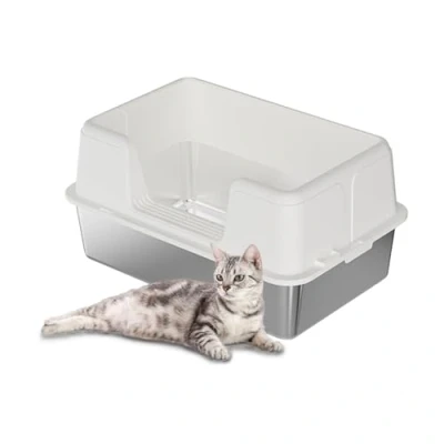 Zstar Stainless Steel Cat Litter Tray with High Side Walls Removable Easy to Clean Lid 60 x 40 36.5 cm White