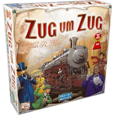 The competitive strategy game Ticket to Ride takes you on a train adventure across the North American cities at the turn of the century After Phileas Fogg travels around the world in 80 days, five friends decided to make a bet. The winner gets $1 million. The goal of visiting most cities of North America Create train connections between cities and build stations to reach your destinations. Trying to build the longest railway track in North America The family game is simple and can be learned in 5 minutes. It appeals to both families and experienced players 2-5 players, from 8+ years, up to 45+ minutes playing time per game, game in German, Manufacturer: Days of Wonder