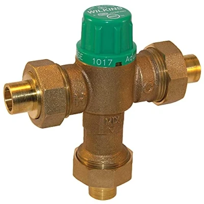 3/4" Aqua-Gard thermostatic mixing valve supplied with three female copper sweat tailpieces and union nuts Installs at the potable water heat source Inlet strainers and check valves included Low-lead law compliant, Weight: 2.0 Pounds, Manufacturer: Zurn