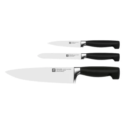 The carefully curated Zwilling J A Henckels Four Star 3 Piece Set includes essential tools for a variety of cutting tasks, ensuring you have the perfect knife for every kitchen task. The set comprises a 10cm Paring Knife (1001533), a 13cm Serrated Utility Knife (1001539) and a 20cm Chef's Knife (1001567). The paring knife is ideal for precision tasks like garnishing and working with small ingredients. The medium-sized utility knife is especially versatile. You can use it for cutting and preparing meat, cheese and other cold foods while the 20cm chef's knife serves as a versatile all-purpose kitchen companion.Key Features:V-Edge Technology: A two-stage process delivers a fine, symmetrical edge with a precise knife angle of around 15 degrees per side, ensuring razor-sharp performance.SIGMAFORGE Precision Forging: The knives are forged using the SIGMAFORGE process, creating a one-piece blade for unparalleled precision and durability.FRIODUR Ice-Hardened Blade: The blades undergo a FRIODUR ice-hardening process, enhancing durability, maintaining exceptional cutting edge longevity, and providing corrosion resistance.Ergonomic Synthetic Handle: Designed for comfort and safety, the ergonomic synthetic handle ensures a secure grip, promoting fatigue-free and precise cutting.Standard Bolster: The standard bolster design provides a seamless transition between the handle and blade, enhancing overall durability and stability.Dishwasher Safe with Hand Washing Recommended: While the set is dishwasher safe for convenience, hand washing is recommended to ensure optimal care and longevity.Manufactured in Germany, the Zwilling J A Henckels Four Star 3 Piece Knife Set comes with a manufacturer's lifetime warranty for your peace of mind.  Knives are not for sale to persons under the age of 18. - all knives and bladed products are delivered by Age Verified Delivery (AVD). The carrier may request proof of age in order to deliver your parcel. If proof of age is not available, or the recipient is underage, the carrier will refuse to deliver.