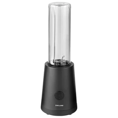 ManoManoGeneral description The Zwilling AC Motor Personal Blender combines 300 watts of power with a high-quality stainless steel cross blade. This blender allows you to mix your favorite fruits and vegetables to create smoothies in seconds. It includes an extra lid that transforms the mixing jar into a travel jug, making it convenient for taking to the office or gym. The compact design and cable reel facilitate space-saving storage. Technical specifications Power: 300 watts Motor speed: up to 23,000 rpm Dimensions: 13.7 cm (L) x 13.7 cm (W) x 35.7 cm (H) Dishwasher safe plastic jug Usage Ideal for on-the-go refreshments Mix fruits and vegetables for smoothies Other information Safety-lock system to prevent leaking Non-slip feet for comfortable and safe handling 2-year warranty Both the jug and the travel lid are dishwasher safe