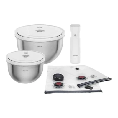 Versatile freshness: the ZWILLING Fresh & Save Bowls starter set with 2 versatile stainless steel bowls (18 and 24 cm diameter) for stirring, serving and storage, plus matching vacuum lids with double sealing technology. Includes 2 vacuum bags S+M (including zip and marinating aid) and a vacuum pump. More freshness: the vacuum lids keep your food fresh up to 5 times longer compared to conventional storage without vacuum. They also fit all DAUB CERAMIQUE bowls (without handles) in the appropriate sizes. Simply place the vacuum pump included in the set on the valve and extract the air in a few seconds at the touch of a button. Robust and hygienic: the bowls are made of high-quality stainless steel. They are dishwasher and freezer safe. They can be stacked inside each other and can therefore be stowed away With the lid, you can stack the bowls on top of each other in the fridge - and store your food without foil. Reusable food storage bags: The Fresh & Save vacuum bags are real all-rounders for the kitchen. They are ideal for freezing and therefore great for meal prep. You can also use it for sous-vide cooking or marinating your food. Box contents: 1 x ZWILLING vacuum starter set, 9 pieces, fresh & save bowls, 1 vacuum pump, 2 boxes (diameter: 18 and 24 cm, capacity: 1750 and 4000 ml, height: 12 and 16 cm, material: stainless steel (container), BPA-free plastic (lid), silicone (valve and seal)), 4 vacuums. bag (2xS, 1.25 L, 2xM, 4 L), incl. zipper and marinating aid, total weight: 1975, 1031015.