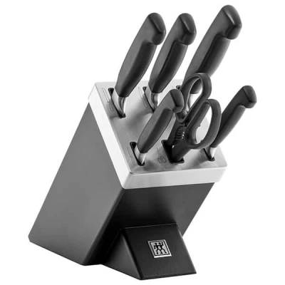 The Zwilling J A Henckels Four Star 7-Piece Knife Block Set in Black with SharpBlock featuring KIS technology ensures knives stay sharp. The self-sharpening knife block set protects knives and eliminates the need for manual sharpening. The knife block works by utilising slots with two ceramic sharpening stones set at the ideal angle for smooth-edged knives (paring, carving, and chef's knives). Every time a knife is taken out or put back, its edge is automatically aligned to keep the knife sharp and ready at all times.This 7-piece knife block set is a standout in any kitchen with its elegant black block featuring a stainless steel cover for durability.Key Features:- SharpBlock with KIS Technology.- Knives are always ready for use.- No additional hand sharpening is needed.- Pictograms on slots indicate the correct knife placement.- Four Star knives made in Solingen, Germany.- Elegant black matte ash wood block.- Set includes: a paring knife (10cm), a utility knife (13cm), a carving knife (20cm), a chef's knife (20cm), a bread knife (20cm), a stainless steel multi-purpose shears (21cm) and a knife block.Additionally, the Zwilling J A Henckels Four Star 7-Piece Knife Block Set comes with a manufacturer's lifetime warranty for your peace of mind.  Knives are not for sale to persons under the age of 18. - all knives and bladed products are delivered by Age Verified Delivery (AVD). The carrier may request proof of age in order to deliver your parcel. If proof of age is not available, or the recipient is underage, the carrier will refuse to deliver.