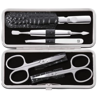 Care routine: 5-piece set with the most important nail care instruments for daily manicure and pedicure from the Classic series Design: Black cowhide case with metal frame in croco look and velvet lining on the inside. Ergonomic shape of the instruments. Optimal companion for on the go or when travelling Material: The instruments are made of high-quality, rust-free, satin-matt stainless steel, corrosion-resistant and nickel-free Gift idea: Whether for yourself or for giving as a gift. For Christmas, Valentine's Day or birthdays Scope of delivery: Consisting of nail scissors, cuticle scissors, sapphire nail file, 2-in-1 manicure instrument and slanted tweezers