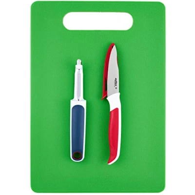 AmazonSet includes Chopping Board, Swivel Peeler and Comfort Paring Knife. CHOPPING BOARD: Textured surface to stop produce moving around the board when in use. PEELER: Strong steel tip easily removes blemishes from produce. The ergonomic handle fits perfectly in the hand, making light work of everyday peeling tasks PARING KNIFE: Durable Taper ground blades in high quality Japanese Stainless Steel stay 'SHARPER FOR LONGER* Swivel Peeler moves easily over the contours of the vegetables for fast and effective peeling