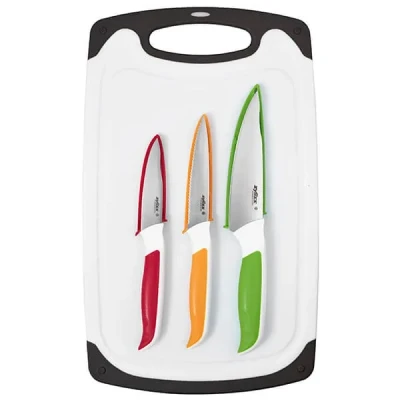 Harts of SturThis Zyliss 4 piece board and knife set is ideal for everyday use. The set includes a non-slip chopping board plus a 8.5cm paring knife, 10.5cm serrated paring knife and a 13cm utility knife.The knives all feature colour coded comfort handles for maximum grip and full control when in use. The non-slip grip handle on the chopping board provides a firm grip even with wet hands.Dishwasher safe for ease and convenience and complete with a 5 year Zyliss manufacturers guarantee.  Knives are not for sale to persons under the age of 18. - all knives and bladed products are delivered by Age Verified Delivery (AVD). The carrier may request proof of age in order to deliver your parcel. If proof of age is not available, or the recipient is underage, the carrier will refuse to deliver.